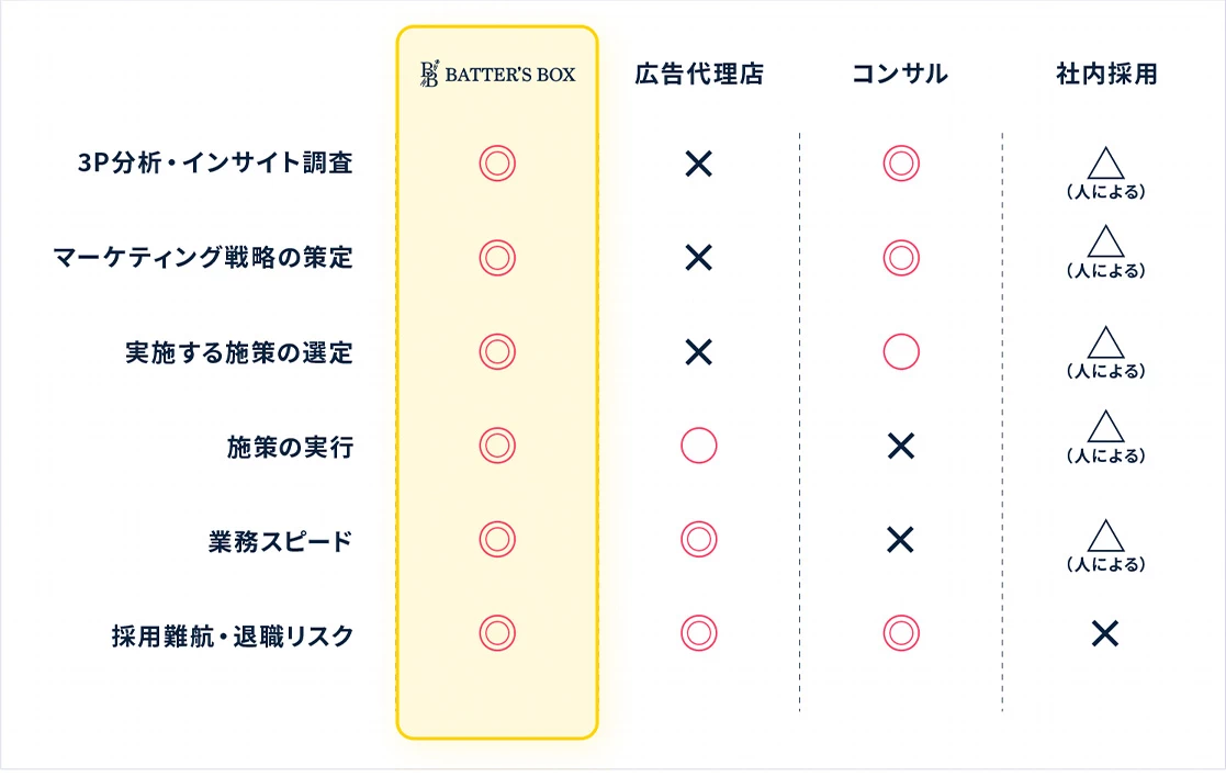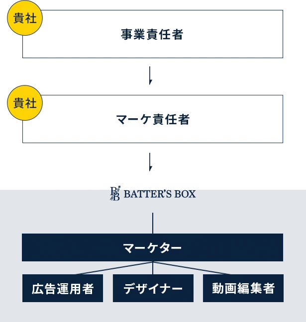 マーケティング業務を実行まで一貫して行う伴走支援サービスです。あなたの会社にプロのマーケチームが加入します。