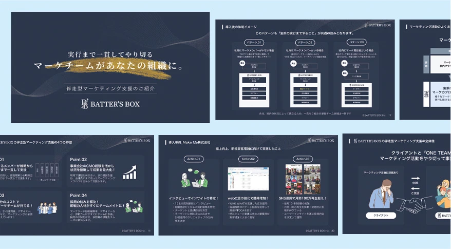 「弊社のマーケティング伴走支援」の基本的な支援内容や具体的な活用イメージがわかる導入事例も含めたサービス資料をお送りします。